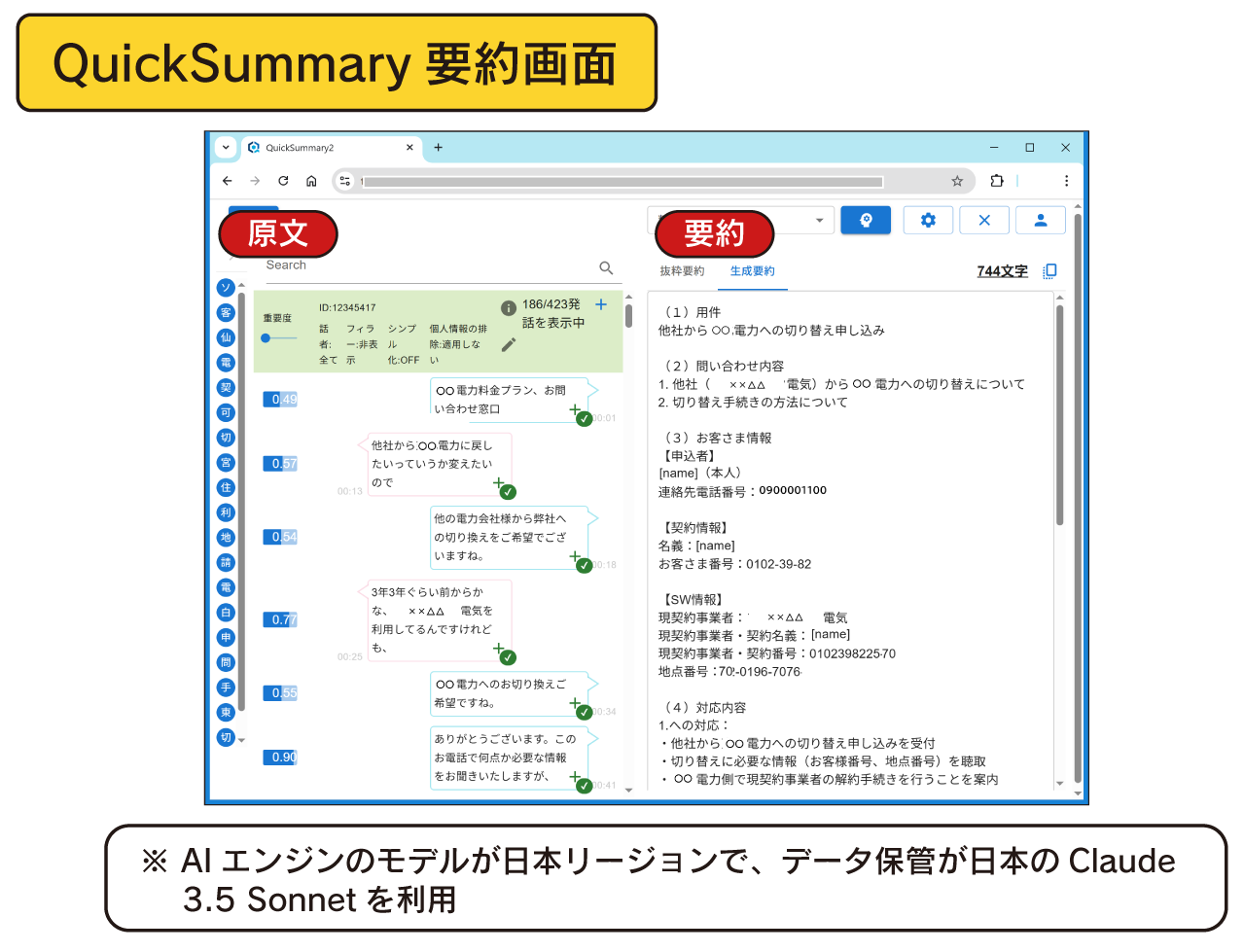 その解決策として、音声認識「AmiVoice API」とAI要約「QuickSummary 2.0」の導入を提案。