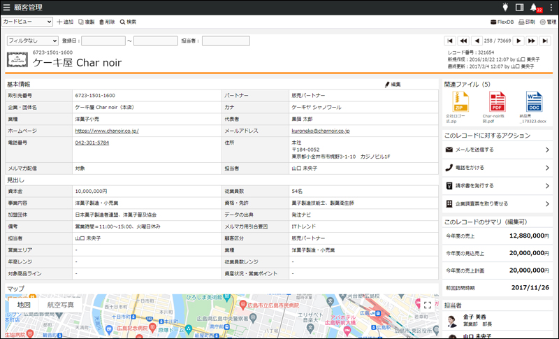 FlexCRMは、顧客の基本情報、連絡履歴、取引状況、問い合わせ内容などを一箇所にまとめることができます。