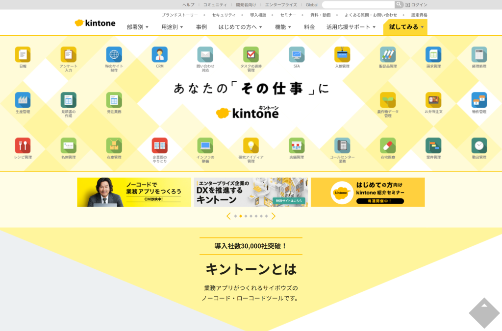 サイボウズ株式会社が提供する、国内導入社数No.1の業務改善プラットフォームです。散在しがちなExcelファイルや紙の書類などを一元管理し、業務に合わせたシステムをプログラミング知識なしで簡単に作成できるのが最大の特徴です。案件管理、タスク管理、日報、問い合わせ管理など、あらゆる業務に対応できる柔軟性を備えています。