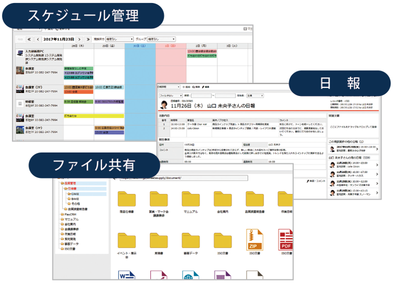 スケジュール共有やファイル共有などグループウェアを標準搭載しています。ファイルの一元管理も簡単で、ドラッグ&ドロップで手軽にファイルを共有できます。