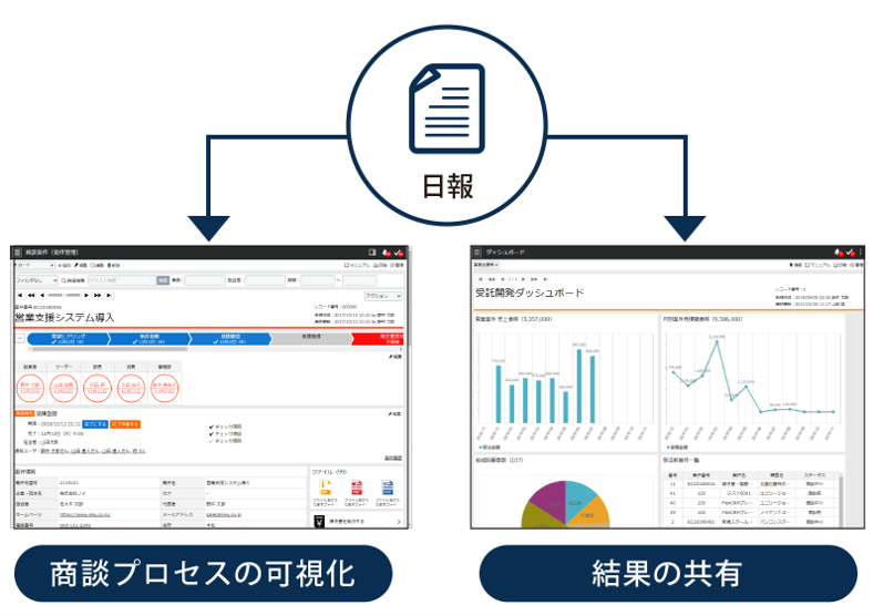 営業活動の効率化を図り、日報や案件管理を基に実績と目標の差異を視覚化。これにより、行動指針が明確になり、営業活動の改善が可能です。