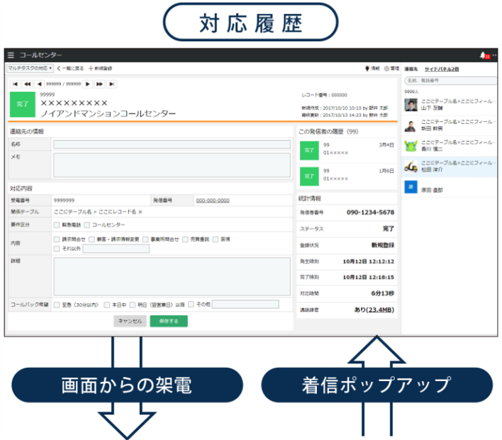 問合せやサポートを向上できます。対応履歴の保存・管理、対応の引継ぎ(エスカレーション)、対応の品質向上のための分析等の機能が揃っています。実際にどんな画面でどんなことができるのかは詳細ページをご覧ください。