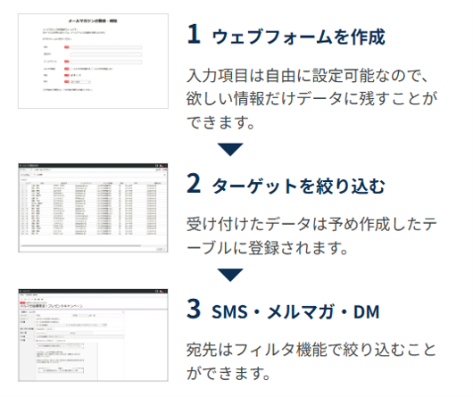 集客施策を支援する多彩なツール(ウェブフォーム、メルマガ、リード管理、ターゲット設定など)を提供。効果的なマーケティング活動を行い、費用対効果を測定しながら施策を実行できます。