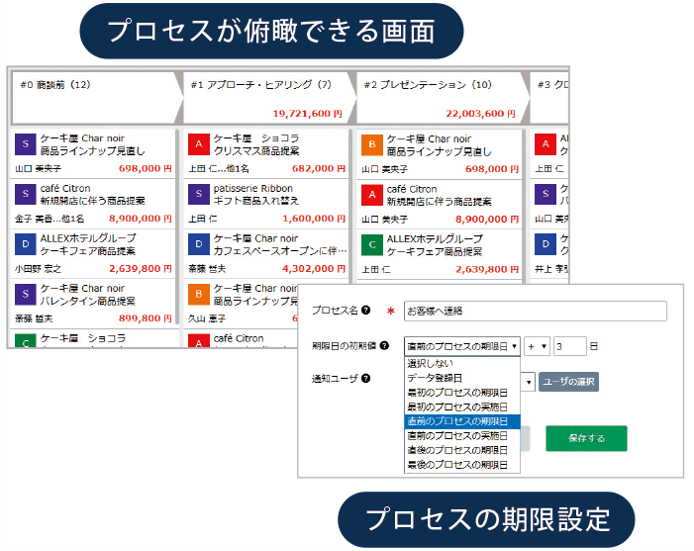 FlexCRMの「業務プロセス管理」機能は、企業の業務フローを見える化し、効率化を図るためのツールです。各プロセスに期限を設定し、進捗状況を一目で確認できるため、スケジュール管理が容易になります。この機能により、属人的な業務の流れを「見える化」し、情報共有を促進することで現場主導の改善が進みます。
