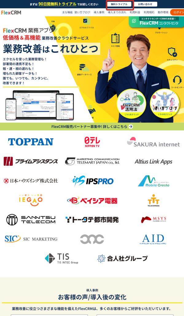 まず、FlexCRMの公式サイトまたは専用ページにアクセスします。