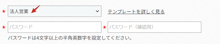 必須項目としてメールアドレス、業務テンプレートの選択、パスワード、氏名、電話番号、