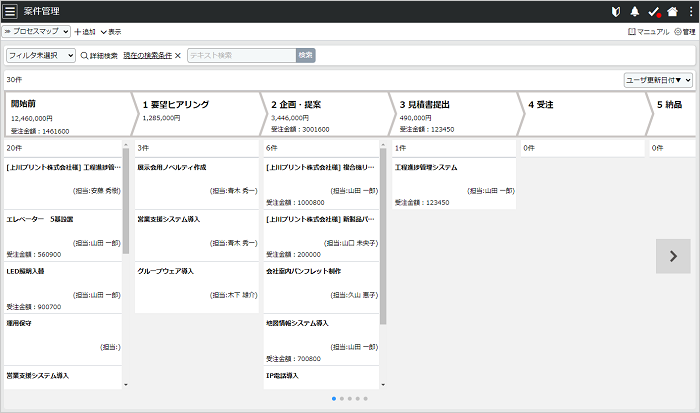 プロセスを設定し、各プロセスごとに期限や担当者を設定することで案件が計画的に進行しているか