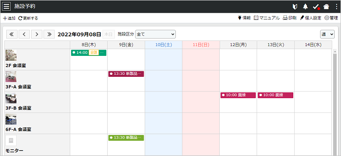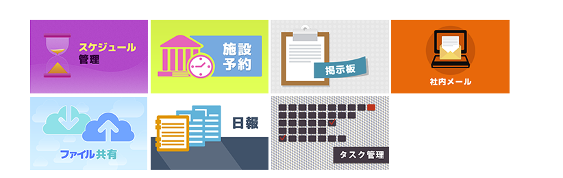 スケジュール管理や施設予約、掲示板、社内メール、日報、タスク管理、ファイル共有の機能を使えます。