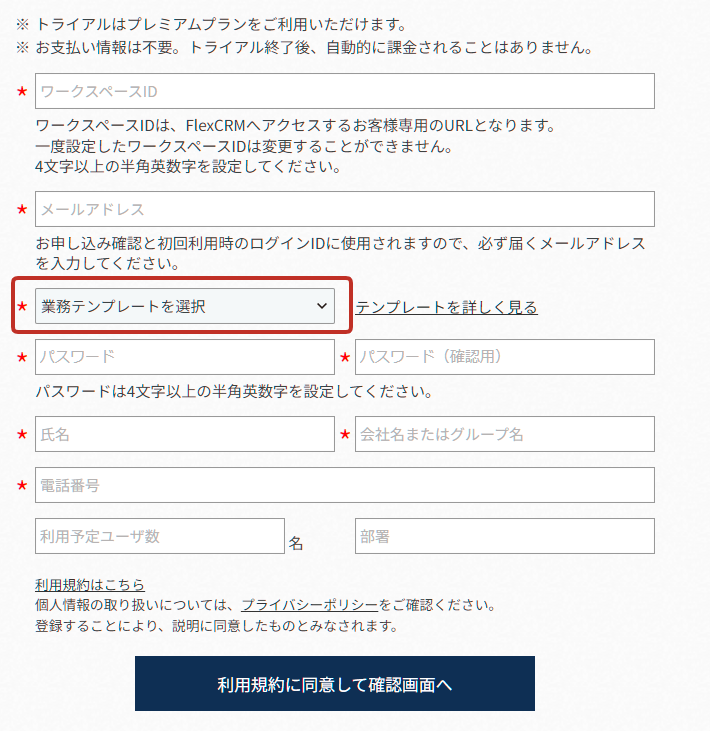 申し込みフォームには、FlexCRMの利用規約やプライバシーポリシーへの同意欄が設けられています。