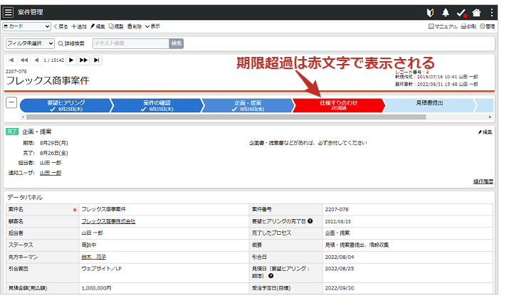 設定された期限より遅れているプロセスは赤く表示され、案件の進捗具合が一目でわかります。