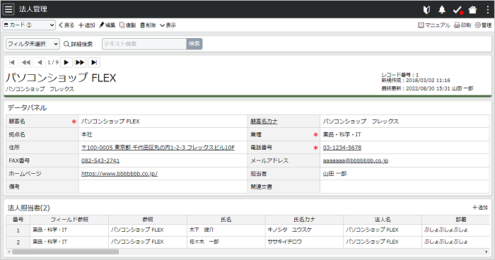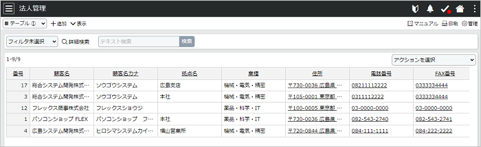 顧客管理では、法人顧客の顧客情報およびその担当者の情報を管理できます。法人顧客を一覧で表示したり、