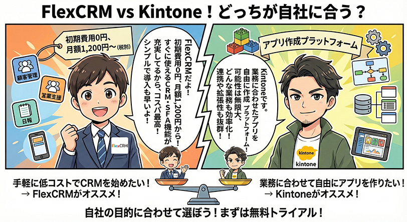 たとえば、FlexCRMは1ユーザーから導入でき、必要な機能を無駄なく使えるシンプルさとコストパフォーマンスが魅力です。一方、キントーンはカスタマイズ性や拡張性に強みがあり、幅広い業種・部署に合わせた柔軟な使い方が可能です。