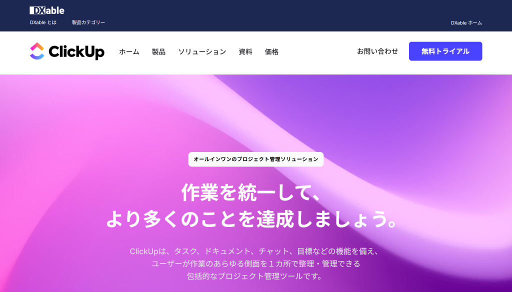 Unlimited:$7〜Business:$12〜 | 無料プランあり | 多機能タスク管理、多様なビュー、ドキュメント機能、目標設定、タイムトラッキング | コストを抑えつつ、高機能でカスタマイズ性の高いツールを導入したい企業 |