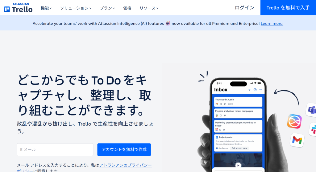 Standard:$5〜Premium:$10〜 | 無料プランあり | カンバンボード、カード管理、チェックリスト、自動化機能(Butler) | 個人や小規模チームで、直感的かつシンプルにタスク管理を始めたい場合 |