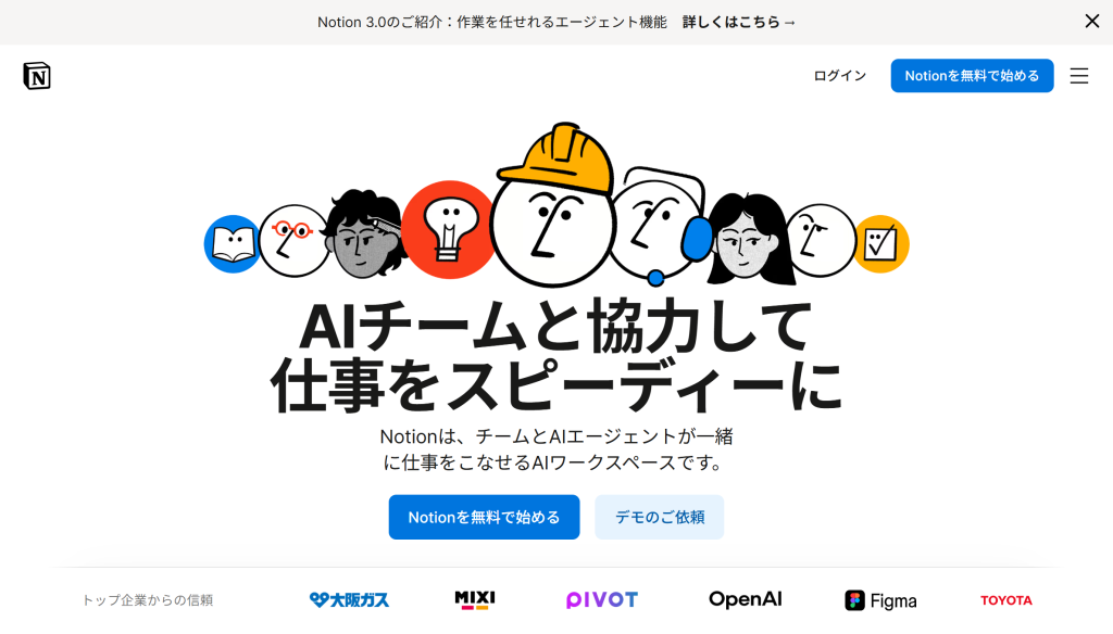 プラス:$8〜 ビジネス:$15〜 | 無料プランあり | ドキュメント作成、データベース機能、タスク管理、Webクリッパー、テンプレート | 社内Wikiや情報共有基盤とプロセス管理を統合したいチームや個人 |