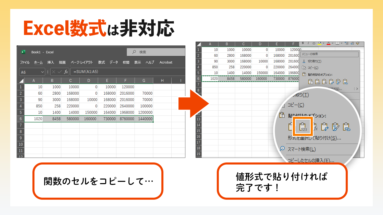 数式や関数には対応していません。数式や関数を使用しているセルがある場合は値に置き換えてインポートしてください。
